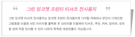 ±×¸° À×Å©Á¬ Ƽ¼ÅÃ÷ Àü»ç¿ëÁö´Â À×Å©Á¬ ÇÁ¸°ÅÍ Àü»ç¿ëÁö·Î µðÁöÅÐ Ä«¸Þ¶ó³ª º»ÀÎÀÌ µðÀÚÀÎÇÑ ±×¸²µîÀ» ÀÌ¿ëÇÑ »çÁø À̹ÌÁö¸¦ Ãâ·ÂÇÑ ÈÄ ´Ù¸®¹Ì¸¦ ÀÌ¿ëÇÏ¿© Ƽ¼ÅÃ÷, Äí¼Ç, Ä¿¹ö, ¾ÕÄ¡¸¶, ¸ðÀÚ µî õ¿¡ Á÷Á¢ Àü»çÇÒ ¼ö ÀÖ¾î ³ª¸¸ÀÇ µ¶Æ¯ÇÑ °³¼º¿¬ÃâÀÌ °¡´ÉÇÕ´Ï´Ù.